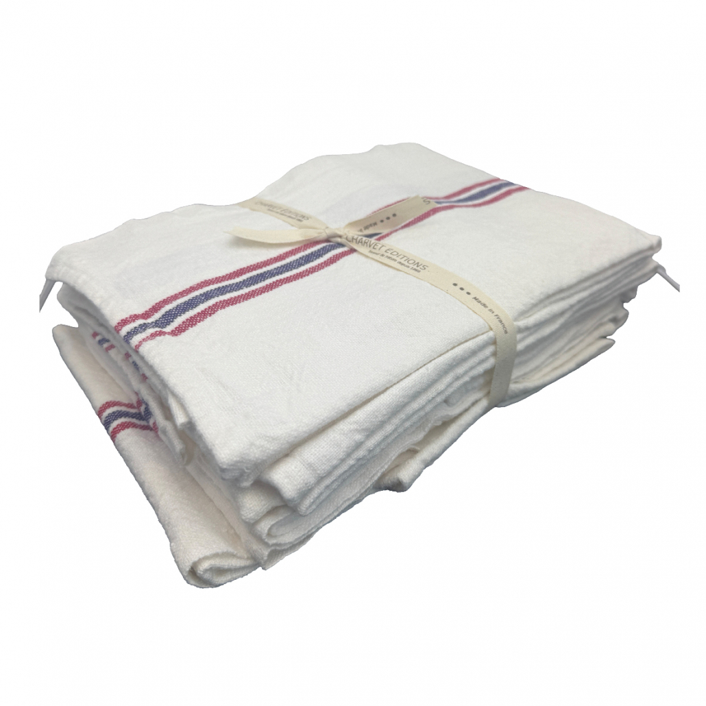 Charvet Geschirrtücher im 6er-Set – aus 100 % hochwertigem Leinen, klassisch weiß mit eleganten rot-blauen Streifen.
