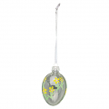 Dekorative Glas-Ostereier im frühlingshaften Blumendesign mit weißer Aufhängung.