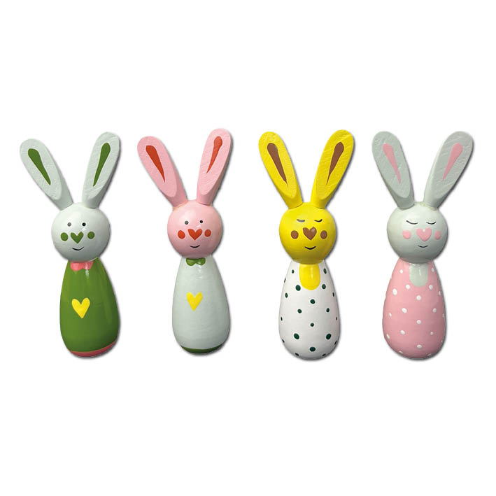 Vier nette Holzhasen, bunt. 4-fach sortiert.