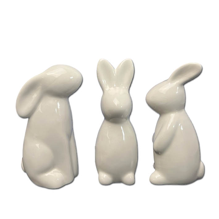 Drei süße Keramik-Osterhasen in weiß. 3-fach sortiert.