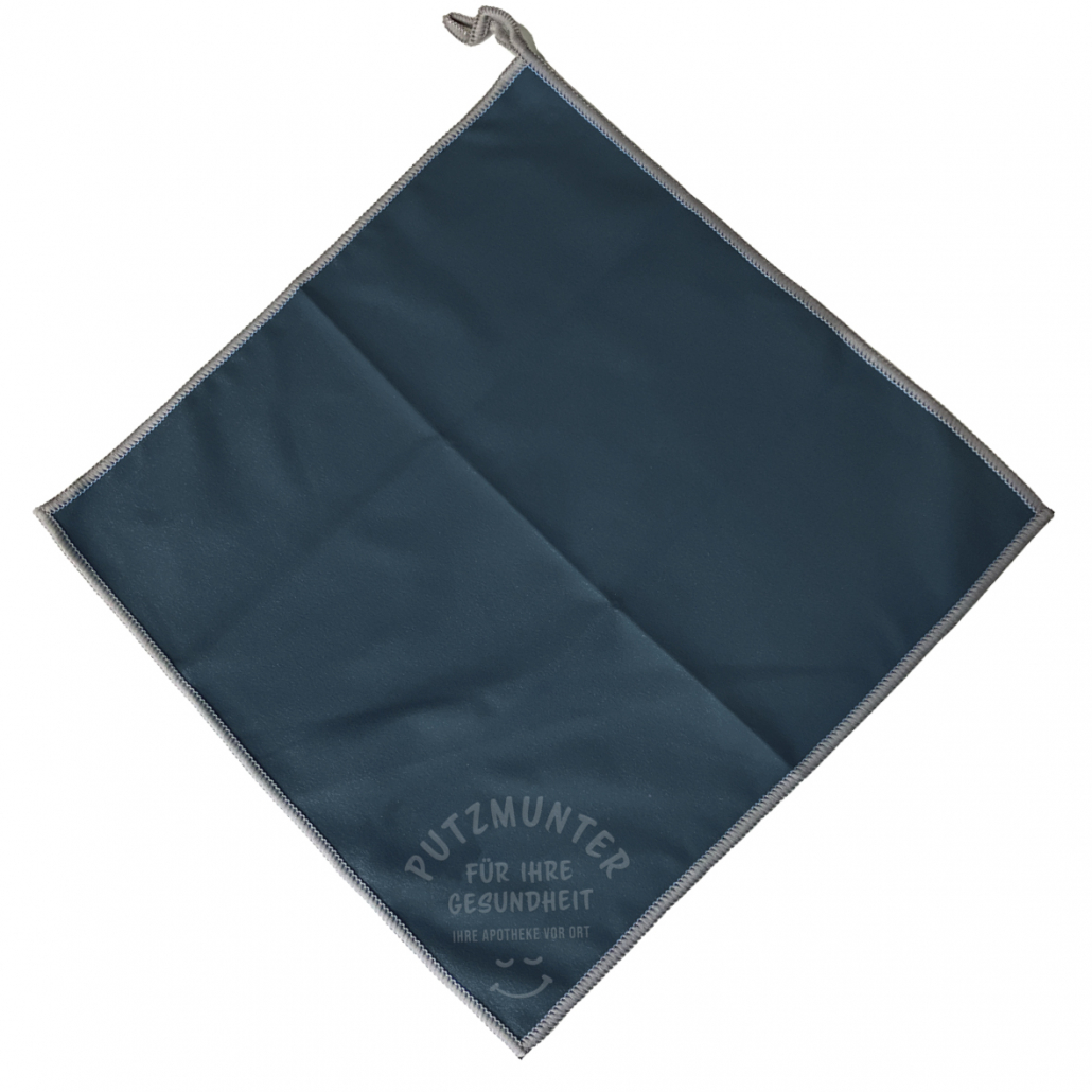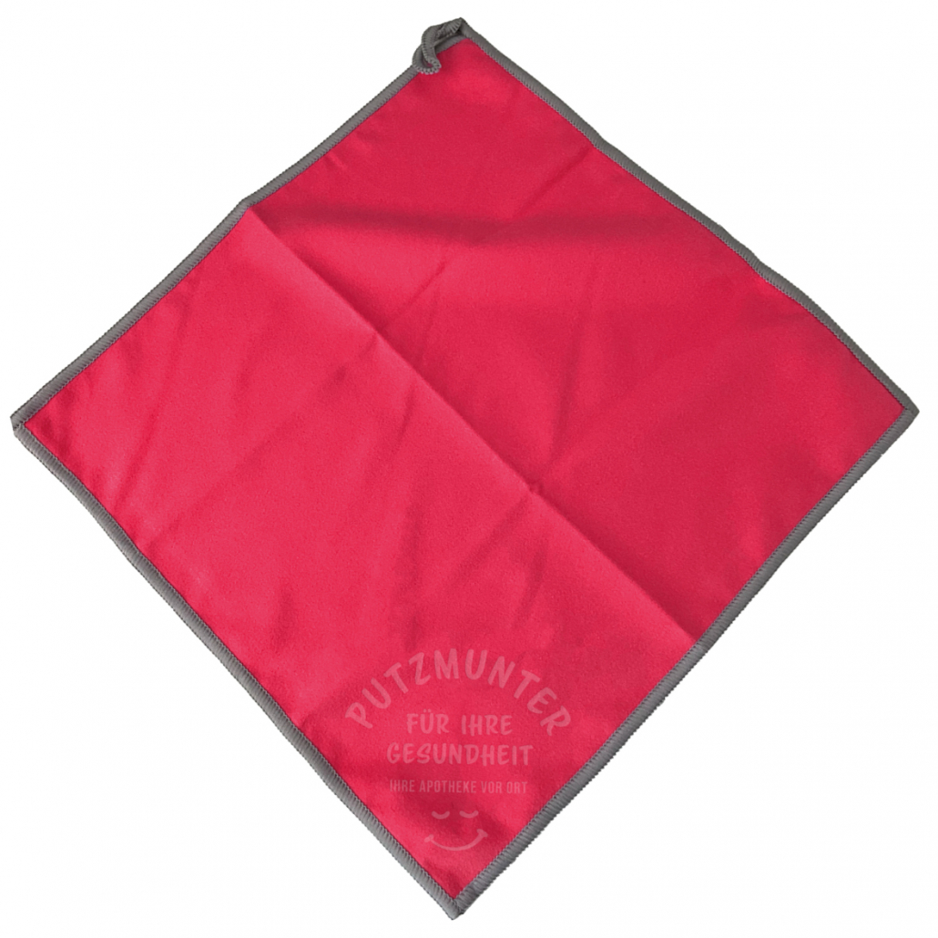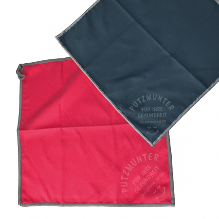 Mikrofasertuch mit „Putzmunter“- Blinddruck. Abgestaubtes Marketing.